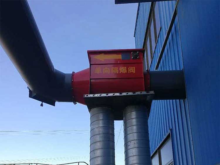 3、進(jìn)入布袋除塵器的主管道上彎頭處安裝泄爆片,泄爆面積不低于管道截面積,進(jìn)入除塵器的主管道上安裝隔爆閥,隔爆閥安裝在室外,并且離除塵器進(jìn)風(fēng)口大約3-5米,不同防火區(qū)域的除塵系統(tǒng)互通互聯(lián)時(shí),通向各防火分區(qū)的主管道應(yīng)該安裝隔爆閥。
