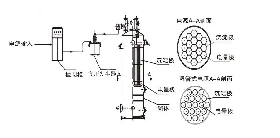 3.噴淋的水蒸氣在冷凝管壁形流動(dòng)成帶電水膜,使纖維粉塵及油霧顆?;胙b置底部流出,從而避免了粉塵和油霧對(duì)電極和管壁的沾污。