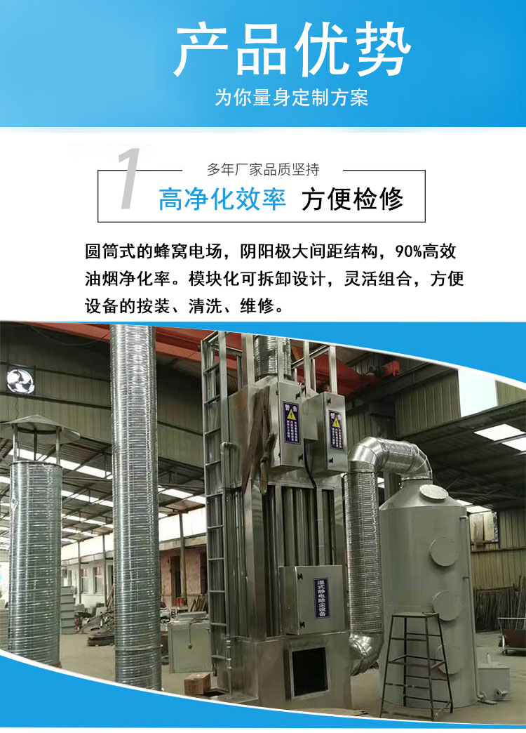 1.高凈化效率:圓筒式的蜂窩電場(chǎng),陰陽極大間距結(jié)構(gòu),90%高效油煙凈化率。