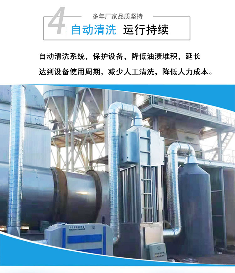 1.采用創(chuàng)新性的噴淋和多層高壓靜電場(chǎng)一體化混合設(shè)計(jì),除塵、除油煙、降溫、滅火效果優(yōu)異,沒有滴油、堵塞、燃燒的現(xiàn)象發(fā)生。