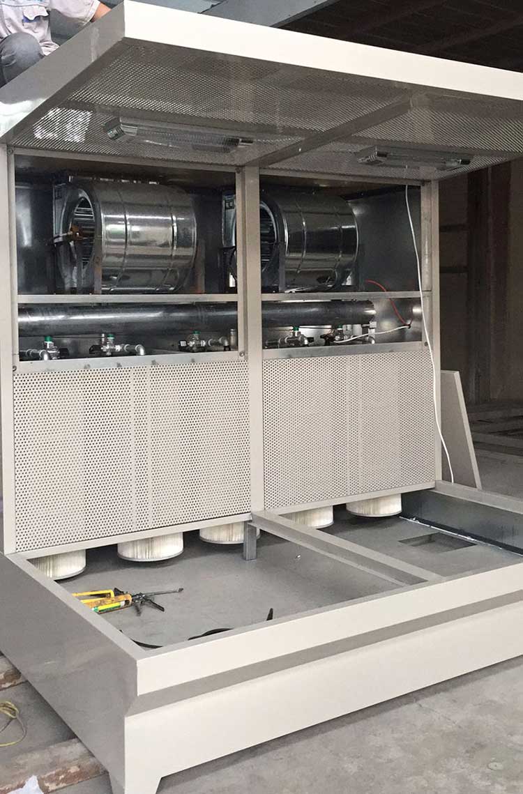 多工位打磨吸塵工作臺工作時,把工件放在工作臺面上打磨,在排風機的抽吸作用下,將工件上打磨出來的粉塵、灰塵等物吸入機內(nèi),打磨出來的粉塵不會在操作者的呼吸處停留,而隨抽風的氣流迅速抽進主機里,帶有粉塵的氣流通過百味窗透過濾芯排風過濾系統(tǒng)流向機外,粉塵顆粒經(jīng)過濾芯過濾后掉下主機的集成箱里,干凈的空氣排出。還有一部分氣體通過回風道經(jīng)過風口棉,再次過濾吹到工作臺面,從而達到循環(huán)的***佳效果。這樣大大改善了工作環(huán)境。