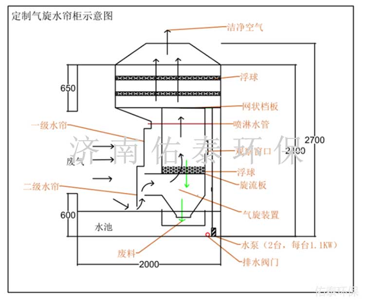 1、氣旋式噴漆水簾柜簡稱氣旋水簾柜,氣旋噴漆柜。該設(shè)備作業(yè)時,粉塵或廢氣在負壓風機牽引力的作用下,噴漆噴膠產(chǎn)生一部分乳化性廢氣顆粒隨水簾落到水池中,大部分廢料進入高速旋流導軌裝置,漆霧、旋風與水在高速旋轉(zhuǎn)的進行氣液乳化反應(yīng)。氣動混流裝置的高速運轉(zhuǎn),使得漆霧與旋轉(zhuǎn)液體充分混合,在離心力的作用下達到漆液分離。氣旋桶內(nèi)部采用水泵循環(huán)給水,由安裝在隔水層底部的螺旋噴嘴噴出來,漆霧分離出來的粉塵顆粒物下沉到水箱底部,分離后的氣體進入環(huán)保填充料隔水層,然后進入后段的廢氣處理設(shè)備。